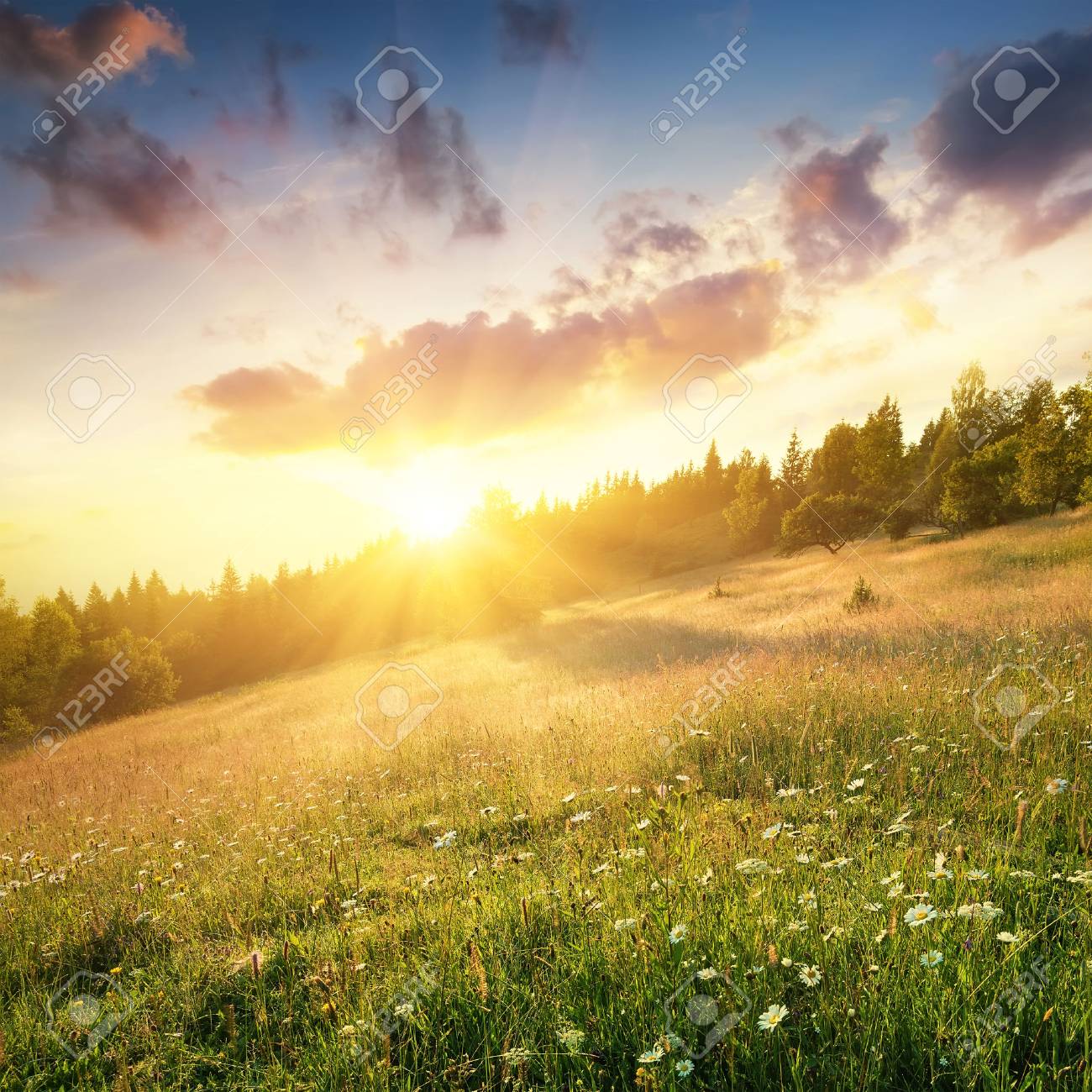 Increible Paisaje Rural Con Amanecer Y Prado Floreciente Imagen De Archivo Imagen De Brillante Horizonte 169904511